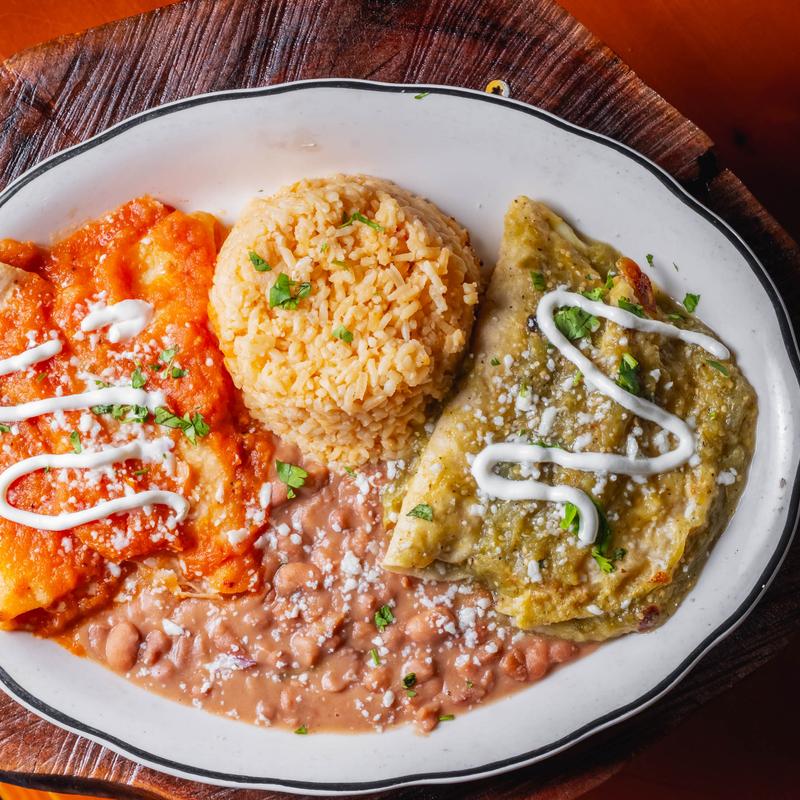 Chips doused in red or green sauce, cheese, and cream, topped with 2 sunny-side eggs.